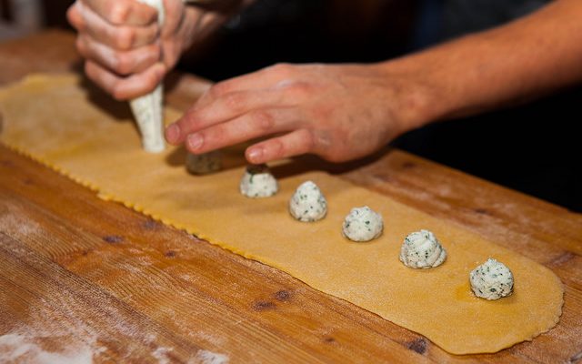 Tirate quindi la pasta con il mattarello oppure con la macchinetta in strisce dello spessore da voi gradito – a me piacciono sottili – e distribuite con una tasca per dolci senza beccuccio il ripieno formando dei ripieni a distanza regolare. Attenzione: il ripieno non va messo al centro della striscia ma piuttosto vicino al bordo. Formate quindi i ravioli piegando la striscia sui mucchietti di pasta ed esercitate una leggera pressione intorno ad ognuno di questi con i palmi delle mani, in modo da fare uscire l’aria in eccesso.